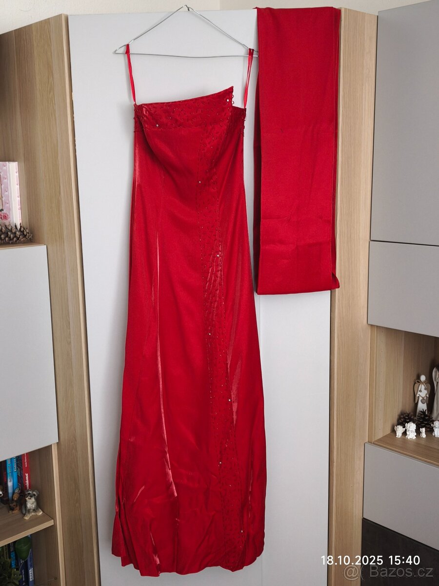 Prodám plesové šaty červené barvy se zdobnými kamínky a šálou. Šaty byly použity pouze jednou. Vel. 38