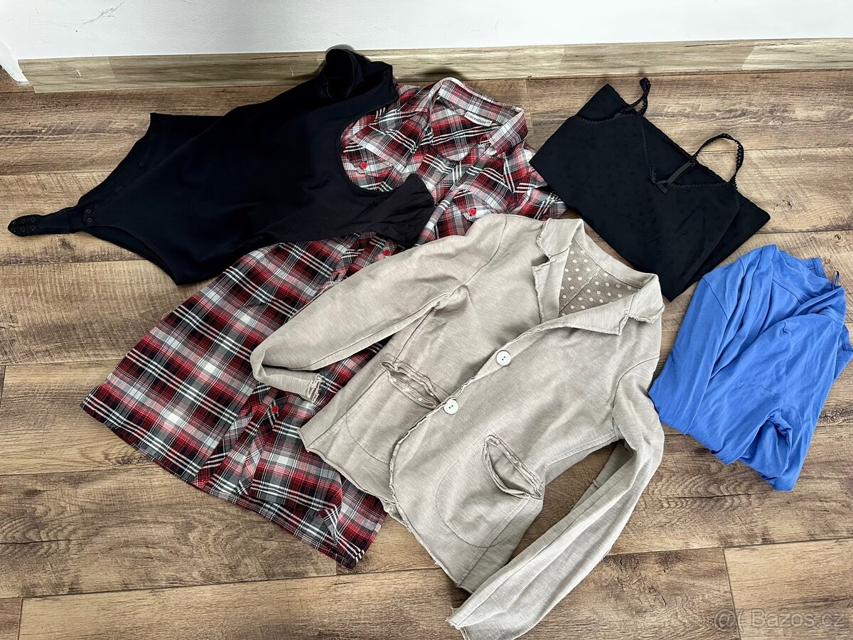 Velikost Xs - 1x body se zapnutím mezi nohami, 1x tílko, 1x sáčko, 1x dlouhá košile, 1x cardigan