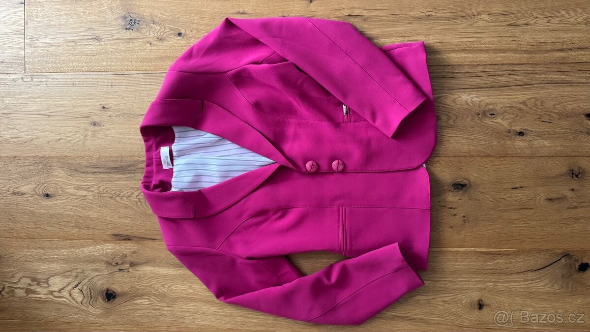 Dánské sako růžové, velikost 36/38, s podšívkou. Sako je málo nošené - téměř nové. Vpředu na zapínání na 2 knoflíky. 70% vlna, 30% akryl, podšívka 100% polyester
