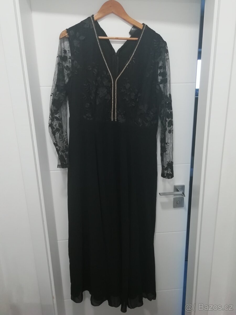 Prodám jednou nošené dlouhé společenské šaty. Velikost 46, Bonprix. Černé, nahoře krajkové, dlouhý rukáv. Vzadu na zip.