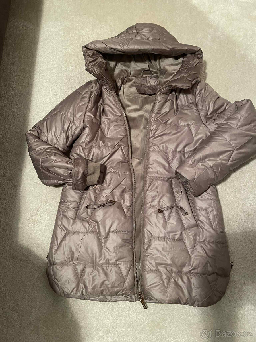 Prodám zimní bundu, Made in Italy, zlaté zipy, detaily na rukávech.Uvnitř je podšitá jemným plyšovým materiálem, který krásně hřeje, lehká, na konci rukávu ještě úplety, kapuce, po straně dekorační zip, na sobě 2x. Vel. XL, 100%polyester. Rozměry: délka rukávu 67 cm,