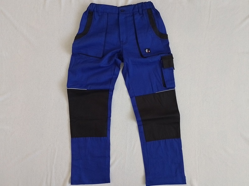 Prodám nové modro-černé pracovní kalhoty, velikost 48 (M). Kalhoty mají přední, zadní a boční kapsy, zdvojená kolena a reflexní doplňky. V pase je guma a poutka na opasek.
