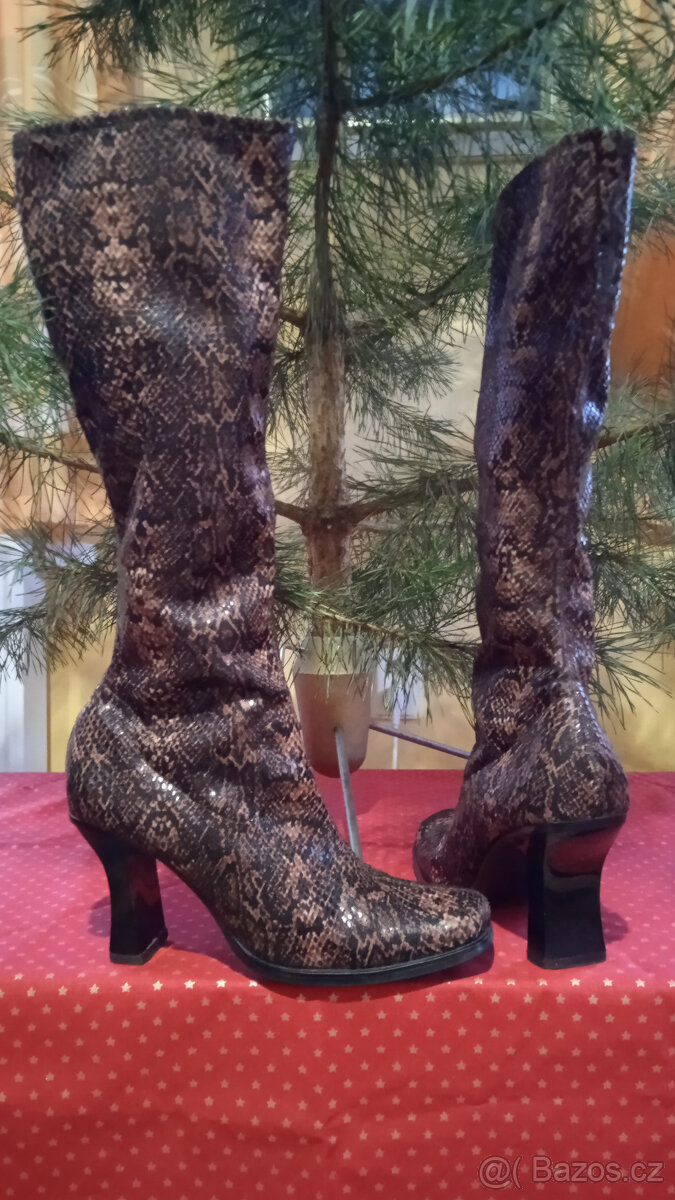 Velikost 38, výška kozaček 44 cm, z toho výška podpadku 8 cm. Obvod kolem lýtka cca 34 cm.