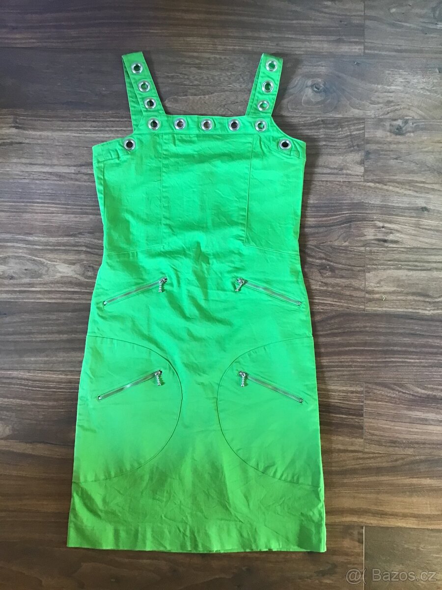Letní šaty vel. 36-38, zelené barvy s ozdobnými prvky stříbrného kovu (zipy, kroužky). Materiál je příjemný, lehce pružný, slušivý střih. Vhodné i do společnosti, na oslavu. Celková délka šatů je 90 cm. Mohu zaslat.