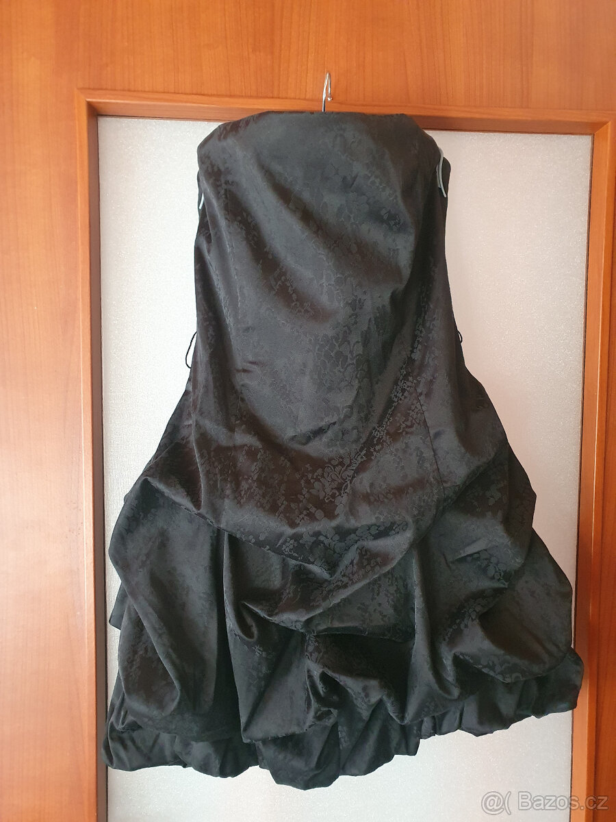 Nové s cedulkou, společenské nadčasové šaty na ples, párty, na večer...matná černá látka s jemným vzorem, vyztužený/korzetový hořejšek, nabíraná sukně, vzadu zapínání na zip. Celková délka ca. 66 cm, šířka v pase ca. 38 cm, šířka nahoře ca. 41 cm. Uvedená velikost 11, odpovídá ca 38. Prodám za 1300 Kč plus poštovné při platbě předem na účet.