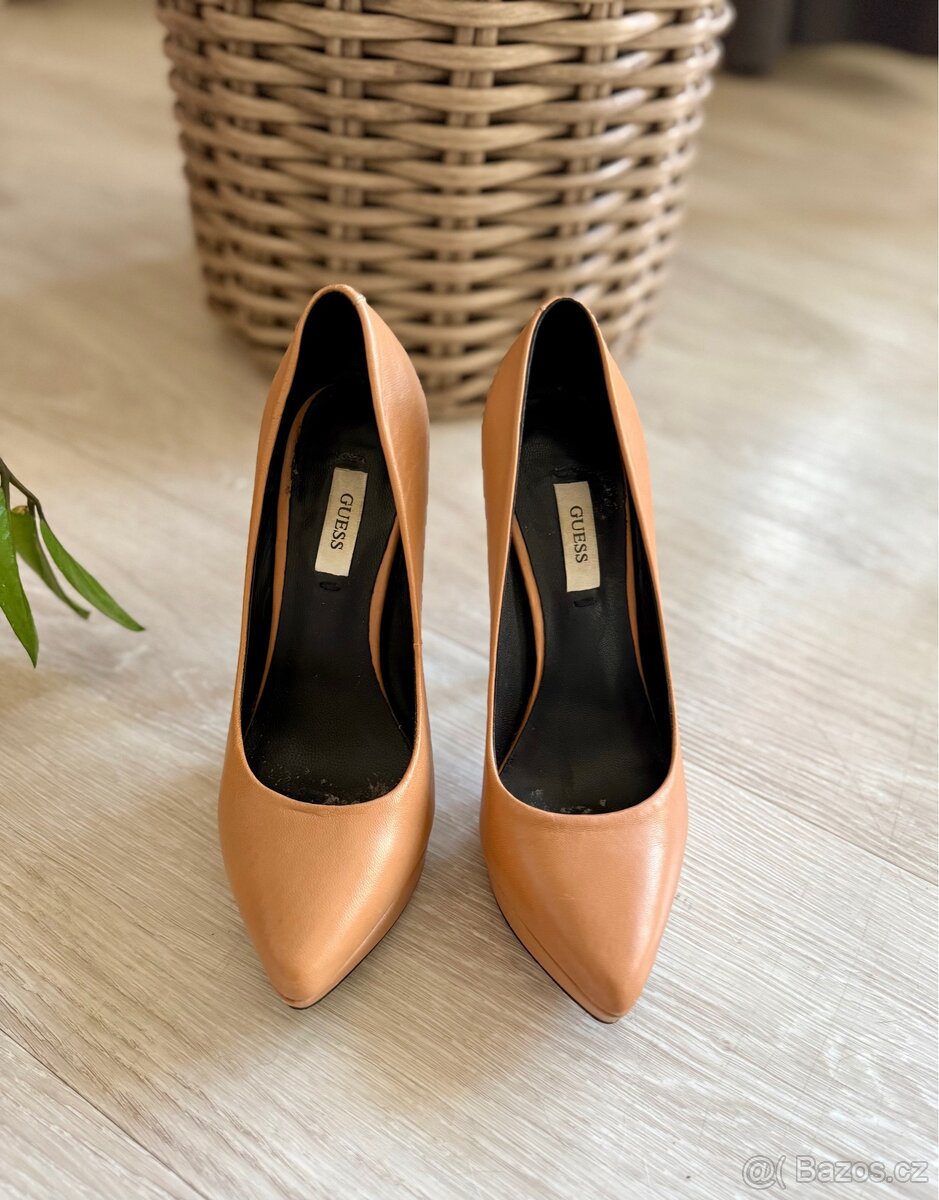 Krásné Guess lodičky. Vel. 35. Kožené, velmi dobrý stav, max. pohodlné. Foto odpovídající skutečnosti. Jeden podpatek je vhodný na opravu, viz. foto. Cena bez dopravy.