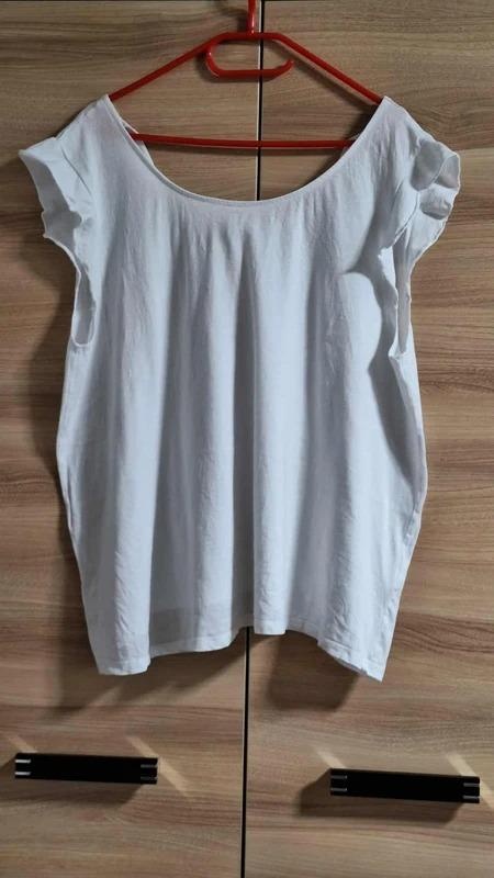 BÍLÉ TRIČKO dámské s volánkovými rukávy, vel.50. Barva sněhově bílá. Krátké rukávy, se šňůrkou - může být vzadu volně na mašličku atd. Pěkné jako nové. Z bavlny a viskozy, bez elastanu, lehké, volné, neobepíná. Délka 70 cm, šířka 70 - 80 cm, střih do A dolů se rozšiřuje. Zn. Blancheporte.