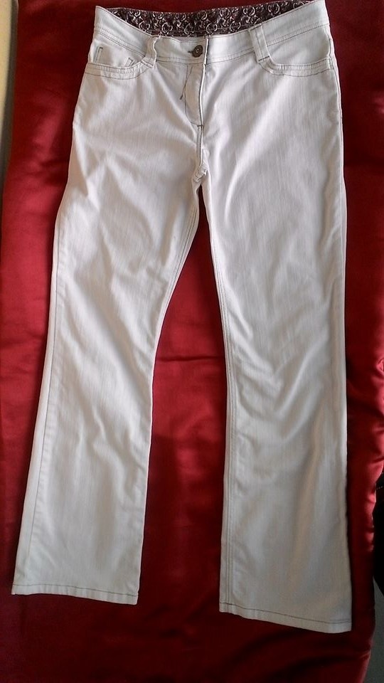 Prodám dámské bílé džíny NEXT, 98% bavlna, 2% elastan. Velikost 40, vnější délka nohavic 104cm, vnitřní 79cm, od zapínání k rozkroku vepředu 24cm, vzadu 34cm. Obvod pasu 88cm, boků 92cm, nohavice v dolní části 47cm.