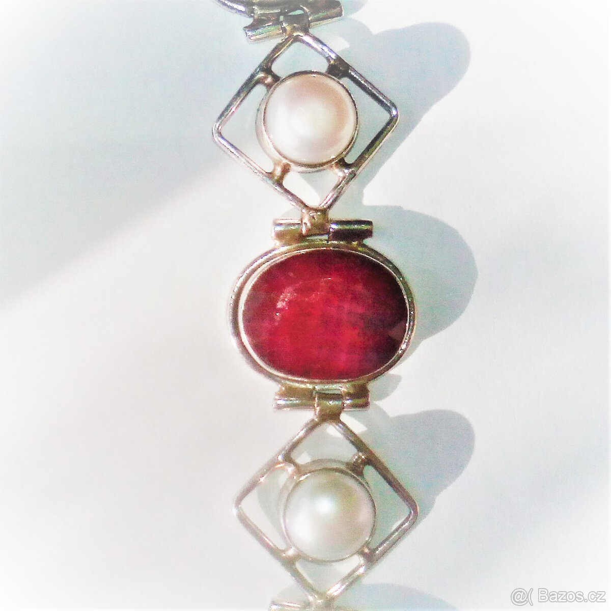 Stříbro a přírodní červené rubíny 3 ks a přírodní bílé sladkovodní perly kultivované 2 ks, hmotnost 22,71 g vč. kamenů, zapínání na karabinu, délka 19,5 cm, variabilní délka zapínání. Zaslání poštou + 100 Kč poštovné, event. na dobírku s platbou poštovného 170 Kč předem. Lze zaslat i přes Balíkovnu a Zásilkovnu. Kontakt e-mail nebo sms.