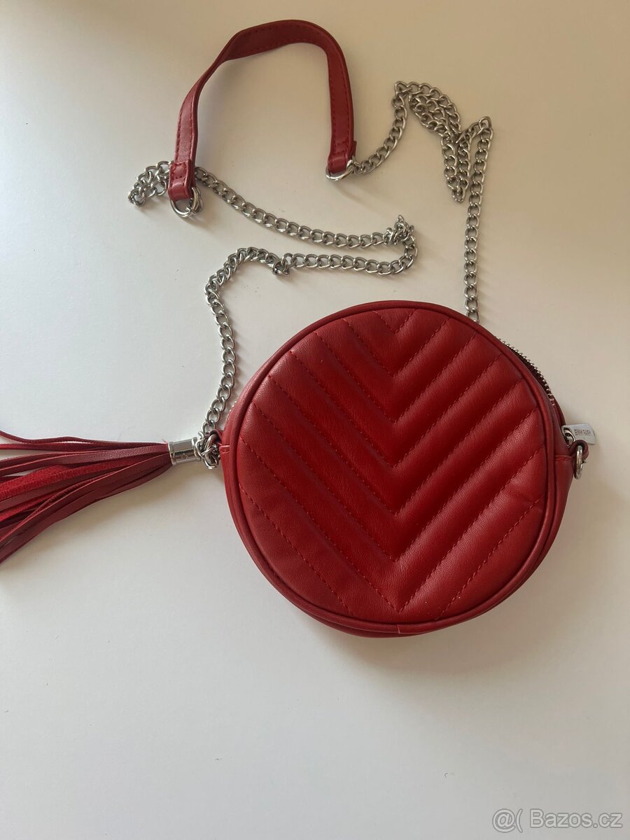 Dámská malá kabelka na rameno zn.Jenny Fairy. Kulatý tvar, popruh kovový stříbrný cca 140 cm, nelze odepnout , ozdobný střapec napevno. Uvnitř černá podšívka, bez kapes. Rozměry 15cmX15cmX4cm. Velmi dobrý stav, cena 270,-Kč