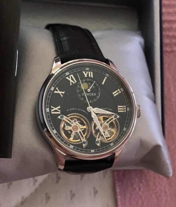 Nové stříbrné unisex hodinky s černým koženým řemínkem švýcarské značky Binger.