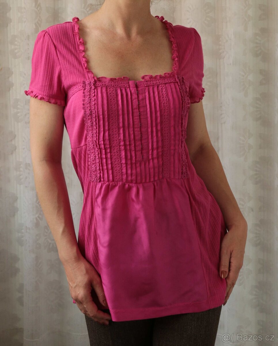 Něco mezi tričkem a halenkou zn. Next, materiál je z větší části tričkovina 65% polyester, 35% bavlna, na předním díle je nařasená část z čistého hedvábí-silk. Obléká se přes hlavu, nicméně háčky na předku jsou funkční. Lehce princesový střih. Hezky vypracovaná, rýšky, volánky, krajka. Top stav. Rozměry ráda zašlu. Odeslání poštou, Balíkovnou nebo Zásilkovnou. Cenu za odeslání sdělím do zprávy.