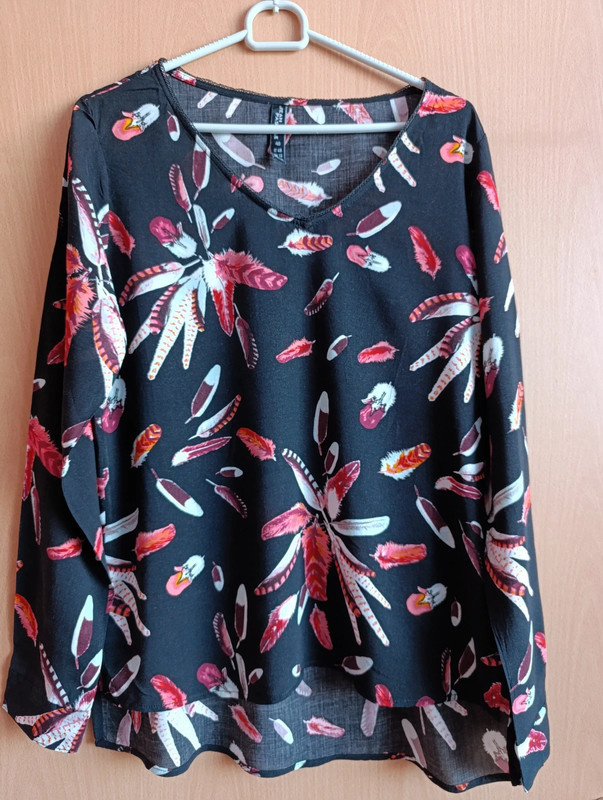 Lehoučká halenka s pírky, vel. M/L, šířka 50, délka 61, délka vzadu 68 cm.