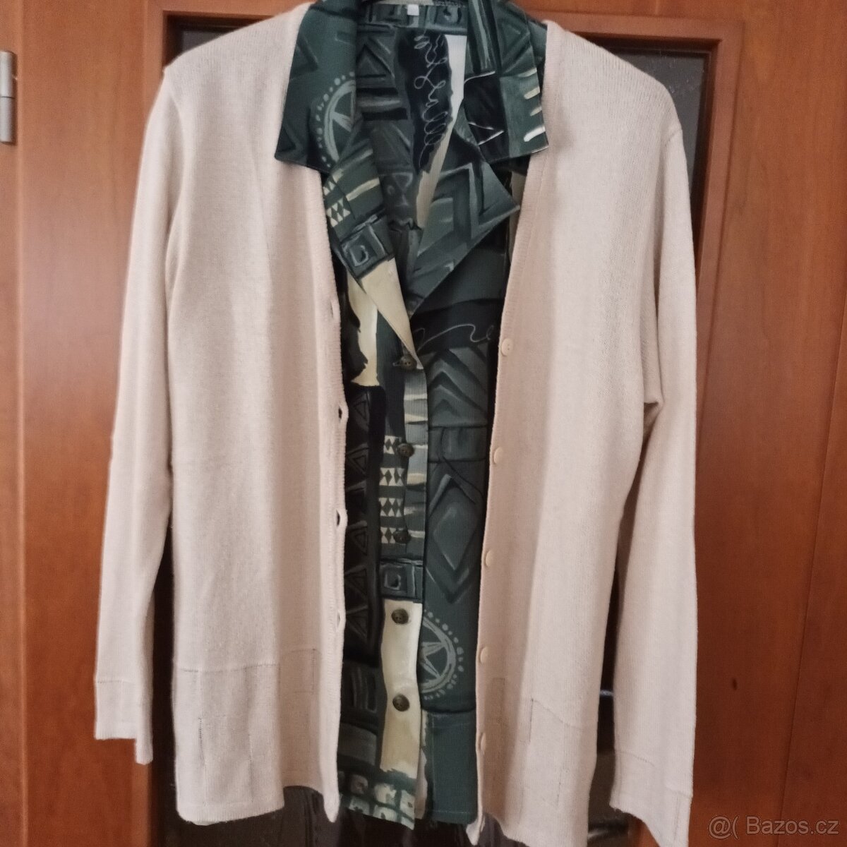 Béžový kardigan vel. 42, délka 70cm, š. 2x 55cm. Materiál pletenina, směs viskoza, polyamid, acryl.