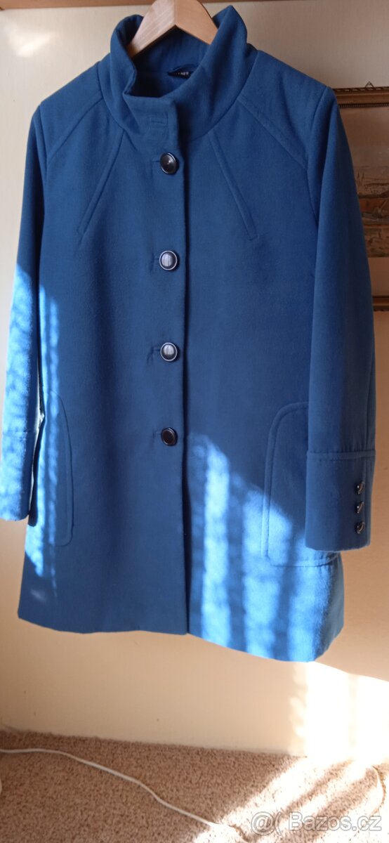 Prodám tento dámský jarní kabátek, je nový, nenošený, barva modrozelená, velikost 46, materiál 90% polyester, 10% viskóza.