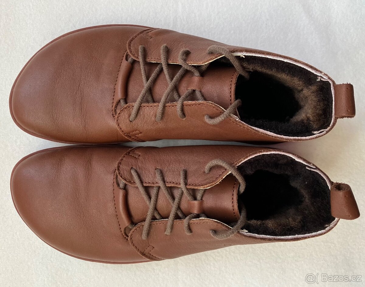 Nabízím dámské hnědé barefoot zimní kotníčkové boty české značky Aylla. Celokožené, zevnitř celé potažené pravým beránkem - i na podešvi. I v rámci barefoot jsou velmi poddajné. Vnitřní rozměr 259 x 99 mm (resp. o něco menší kvůli kožíšku, podle výrobce např. o 0,5 cm kratší). Jen koupené, nenošené!