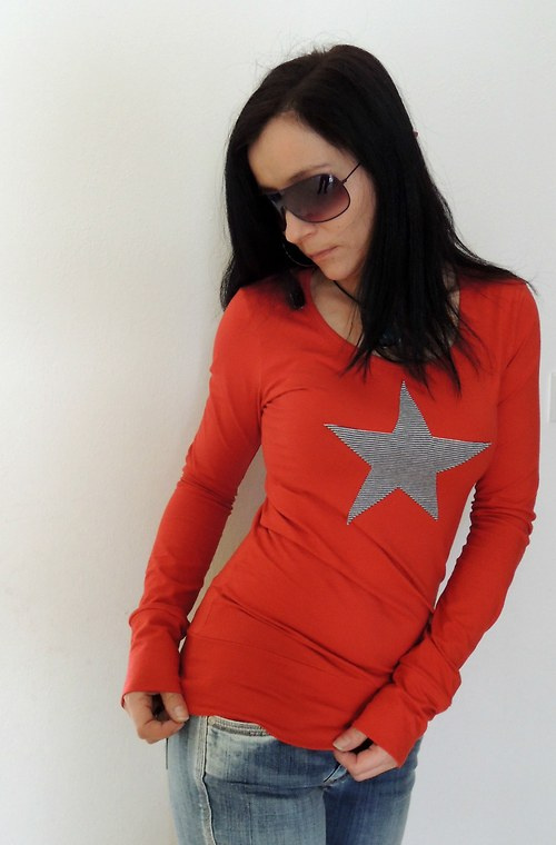 Prodám červenocihlové triko projmutého střihu, rukávy jsou ukončené širokými lemy, aplikace hvězdy je z modrošedého proužku,stejně jako nášivka ve výstřihu. Délka 66 cm, prsa v nenataženém stavu 2 x 40 cm, délka rukávu 61 cm. Cena 199 Kč + poštovné, popř. zásilkovna nebo osobní předání v Poličce.