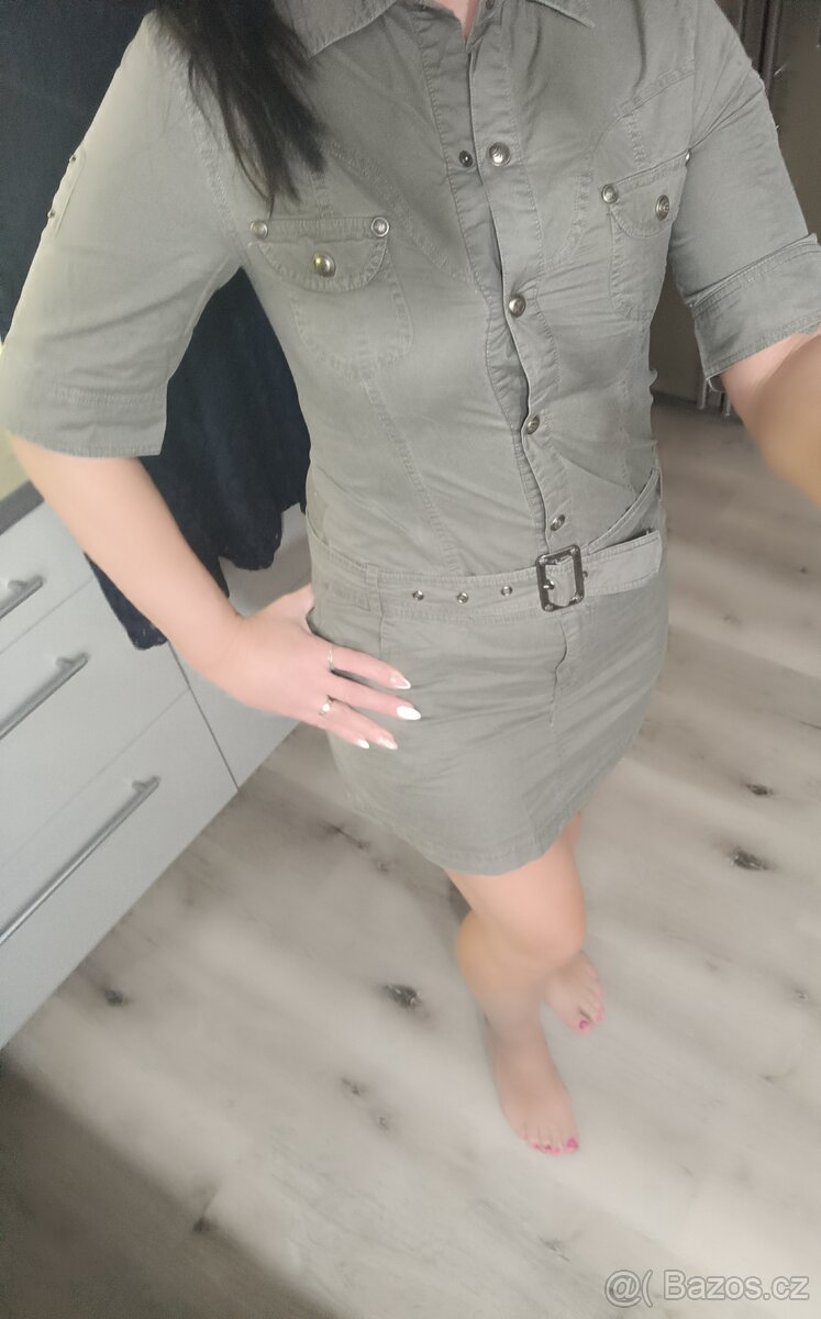 Dámské košilové šaty vel. M, šaty jsou velice pěkně propracované. V přední části rozpínání na patenty a část spodní části je na zip, rukávy se dají zkrátit a připevnit patentem. Velikost je psaná vel. L ale odpovídá spíše vel. M, míry viz. foto.