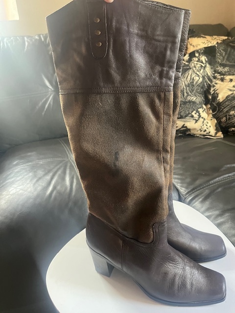 Dámské kozačky - [21.2. 2026]kožené, vel. 38, tmavě hnědé, podpatek 6 cm, velmi pěkné, kombinace kůže - semiš.Odběr Praha a Písek a okolí či zaslání balíkovnou či zásilkovnou.