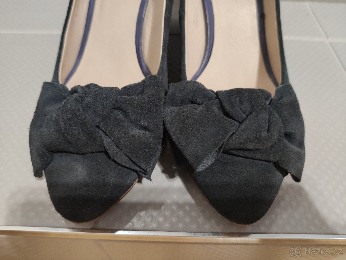 Semišové kožené lodičky na klínku. V předu ozdobná mašle.Málo nošené,pěkný stav. Kůže bez opotřebení. Velikost 40. Výška podpatku 7,5 cm.Osobní odběr v Praze 6 jinak zasilkovna za 60 Kč.