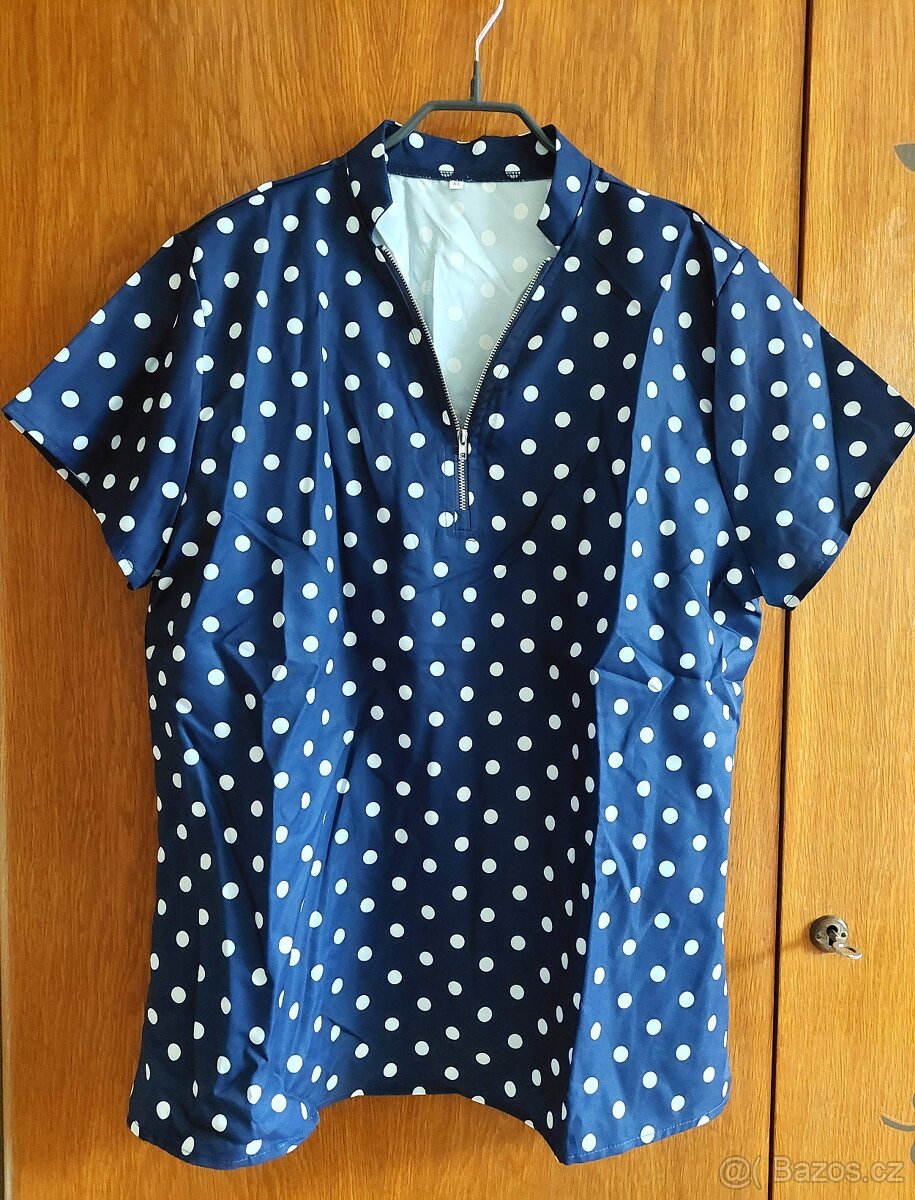 Prodám novou tm. modrou halenku s puntíky vel.XL, nenošeno, rovný střih. Délka 66cm, přes prsa do 115cm. Nenošeno, vybrána špatná velikost. Zaslání zásilkovna, balíkovna po předchozí platbě na účet.