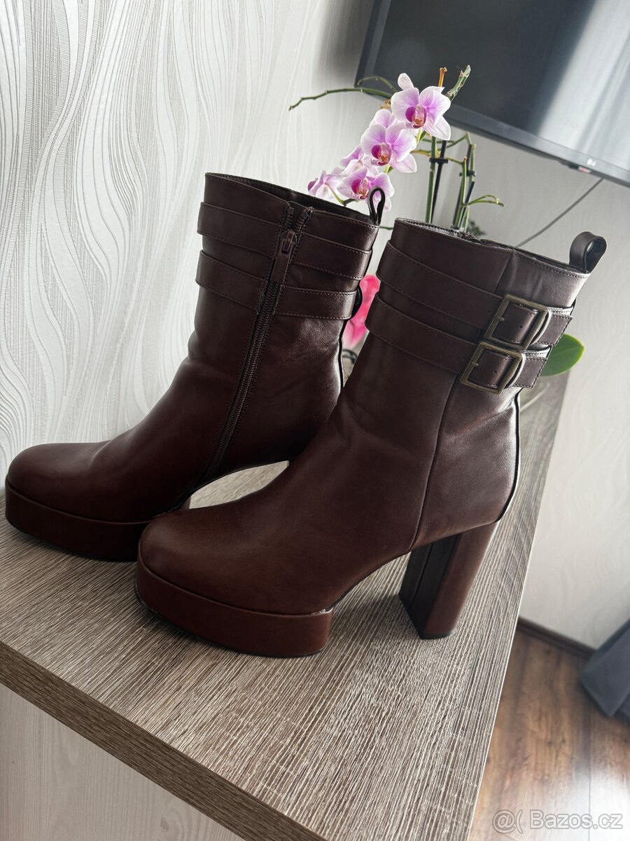 Úžasně pohodlné, širší, kotníčkové boty na platformě a podpatku. Vel. 41, délka stélky 26,5cm. Výška platformy a podpatku viz foto. Měla jsem je na sobě akorát 2x na akci a již pro ně nemám využití.