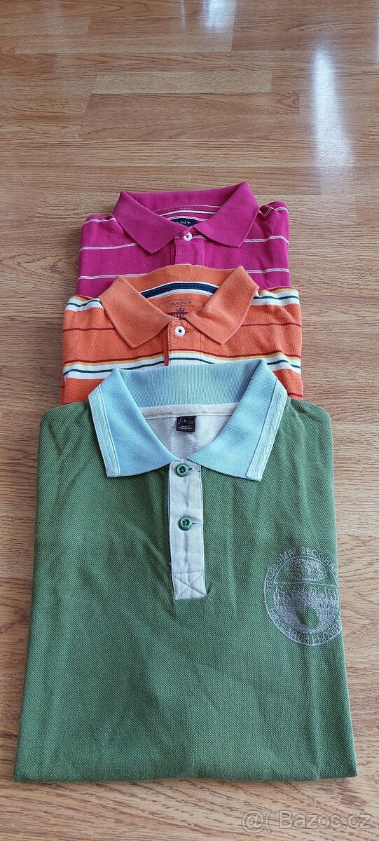 2x Gant,zelené Napapijri. Nošené, v dobrém stavu. Vel. růžové a zelené L, oranžové M.