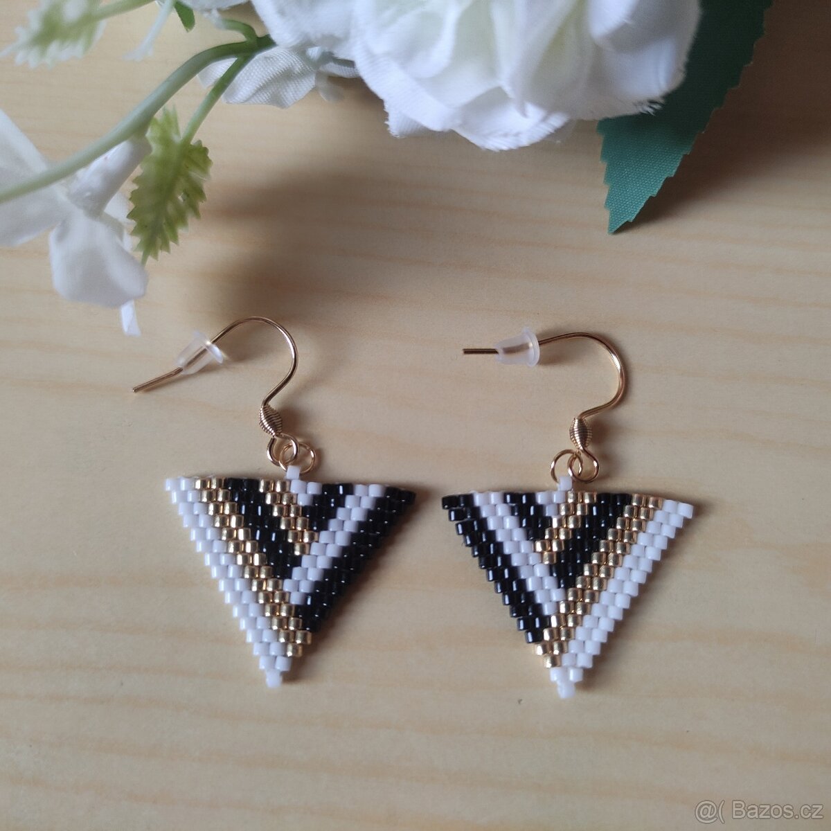 Ručně šité z kvalitních japonských korálků Miyuki v barvách černá, bílá a zlatá. Háčky z nerez oceli ve zlaté barvě. Celková délka 4 cm, šířka cca 2,5 cm.