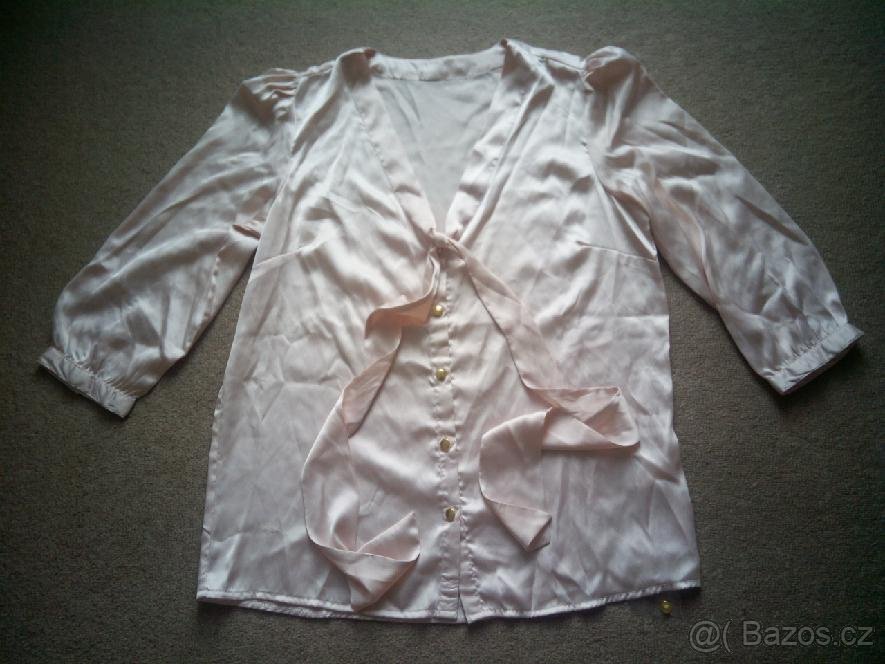 Dámská starorůžová saténová košile s mašlí vel. 36, materiál 100% polyester, koupeno v butiku. Splývavá jemná košile s V výstřihem zdobeným stuhou, zlatými knoflíčky, řasené rukávy, zášivky na prsou. Velice elegantní a pohodlná košile vhodná spíše na společenštější využití, ale s riflemi udělá taky parádu. Oblečena asi 1x, náhradní knoflík ještě na halence, top stav, bez vad.