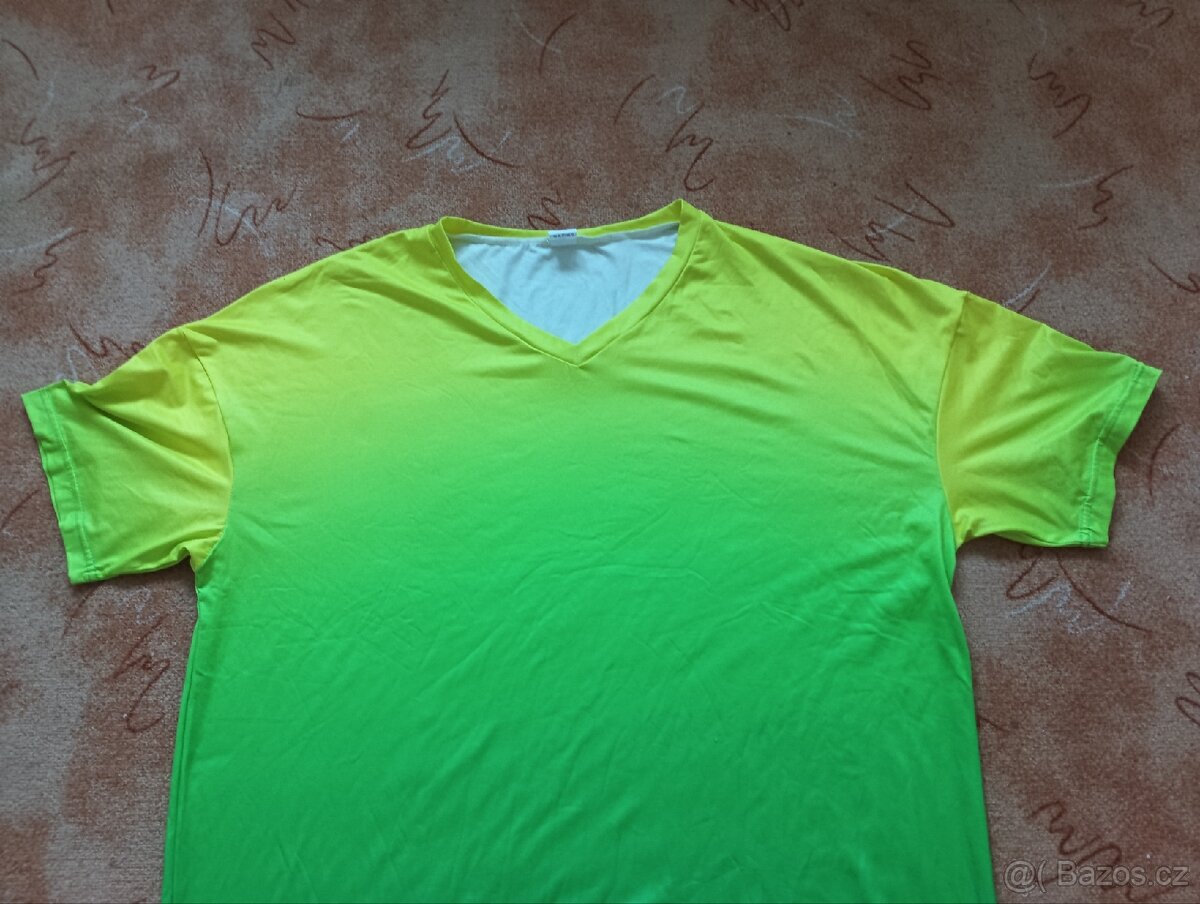 Prodám nové,pouze vyprané tričko s krátkým rukávem UNISEX,vel.XXXL.Barva žlutozelena, materiál polyester.Sirka: 2x65cm,rukav:19cm, spadlá ramena:73cm,délka:76cm.