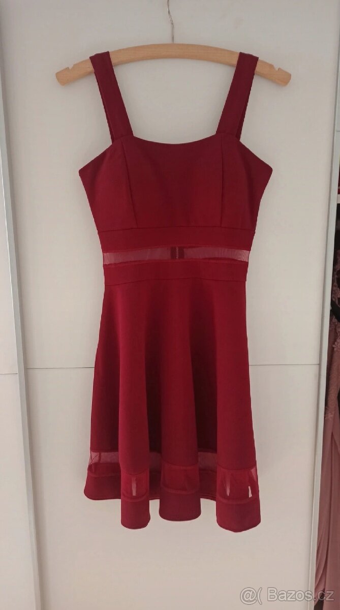 Červené šaty velikosti S, velmi hezky tvarují postavu, na zip, přes prsa jsou všité vycpávky, bez vady