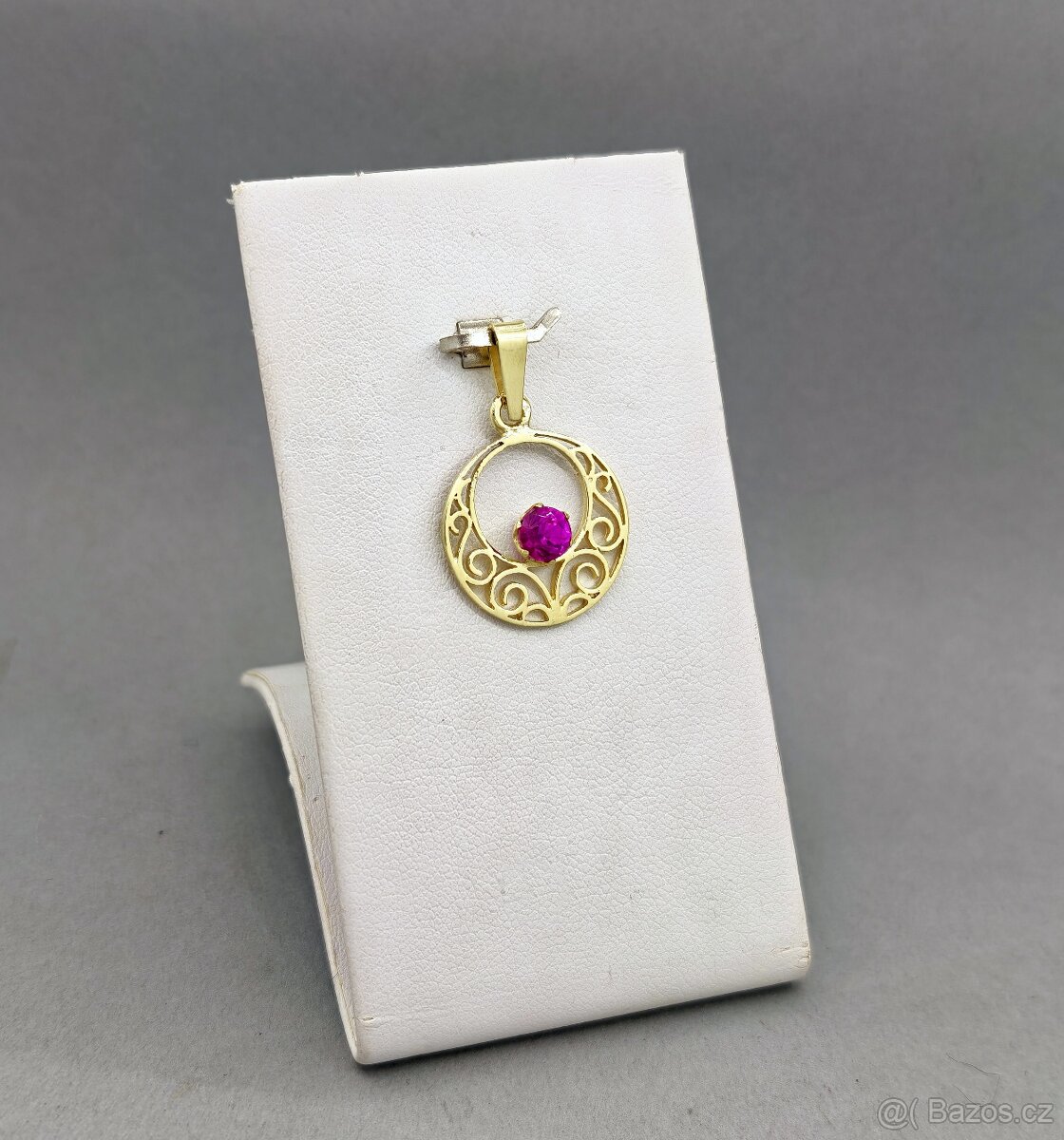 Nabízím uvedený zlatý přívěsek s rudým kamínkem. Velmi hezky zpracovaný, průměr cca 1,78 cm. Váží 1,86 gramu a ryzost je 585/1000.