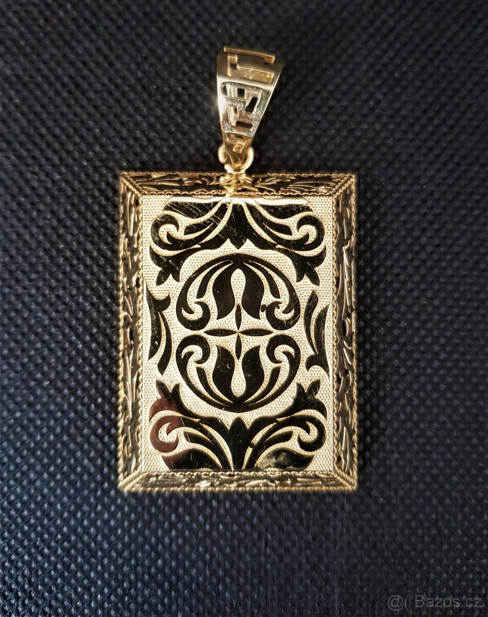 Prodám velký přívěsek destička s pěkným barokním rytím o váze 12,54 gramů, rozměry 4,4 cm x 3,3 cm x 0,6 cm, tloušťka oka 0,8 cm. Český punc 14 kt. Vážní zájemci volejte!