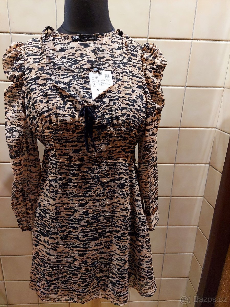 Elegantní společenské šaty. Nové s visačkou. Značka ZARA. Velikost XS 34 6/ S 36 8. ⁰⁰U ramen nabírané rukávy. Černá sametová stužka u výstřihu. Zip je na boku. Černá spodnička. Látka je příjemná vzdušná průsvitná. Vzor zvířecí kůže. Rukáv 57 cm. Délka 81 cm. V průramku 39 cm. Pas 34 cm. Látka je elastická.