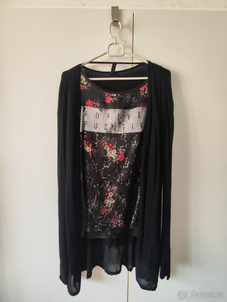 Dámský svetřík s halenkou s krátkým rukávem. Koupeno jako komplet. Halenka délka 64cm, šíře pod pažemi 51cm, velikost psaná S. Svetřík délka 83cm, šíře pod pažemi 49cm, rukáv od krku 84cm, velikost psaná M. Značka Jean Pascale