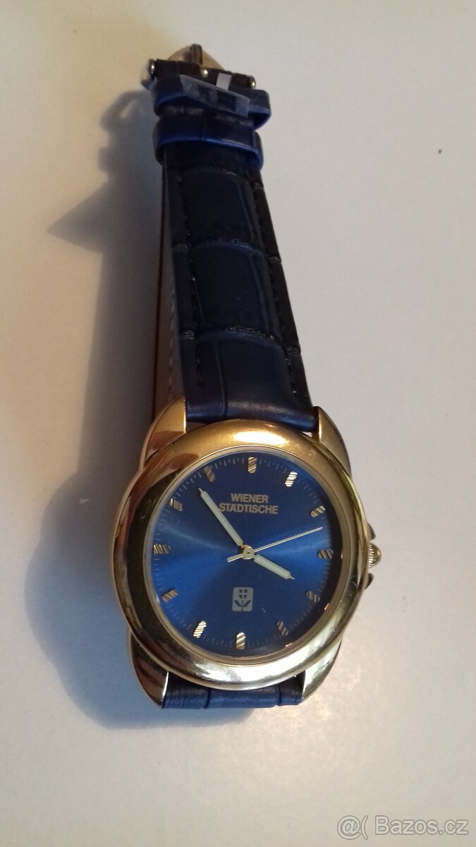 puzdro je v zlatej farbe s modrym cifernikom o priemere 36 mm