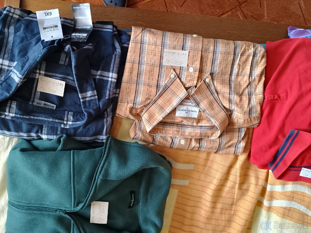 Nabízím nenošené košile s dlouhým rukávem á 150,- Kč, polokošile s krátkým rukávem á 50,- Kč, zelená mikina na zip velikost 4 XL za 200,- Kč z důvodu nevyužití.