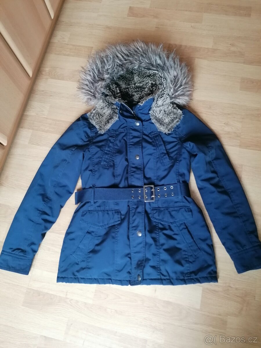 Krásný tm. modrý kabátek s utahováním v pase- viz detaily. Odepínací kapuce + odepínací kožíšek kolem kapuce, 4 kapsy. Délka 70 cm, rukáv od kapuce 74,5 cm, šířka v podpaží 50 cm, dole 56 cm. Mohu poslat do zásilkovny za 89 kč