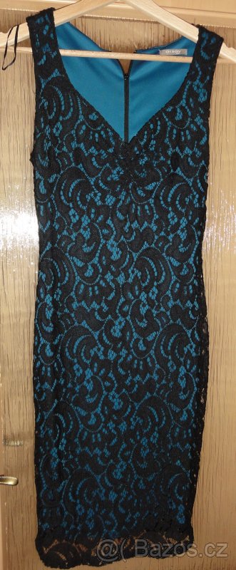 Prodám černo-tyrkysové krajkové šaty z Orsay, pouzdrový střih, zapínání vzadu na zip, výstřih do V, uprostřed nabírané, délka krajkové části 95 cm, délka tyrkysové podšívky 90 cm, velikost 34, vrchní materiál 100% polyamid, podšívka 100% polyester. Pouze jednou nošené. Nabízím k nim i černé krajkované sáčko