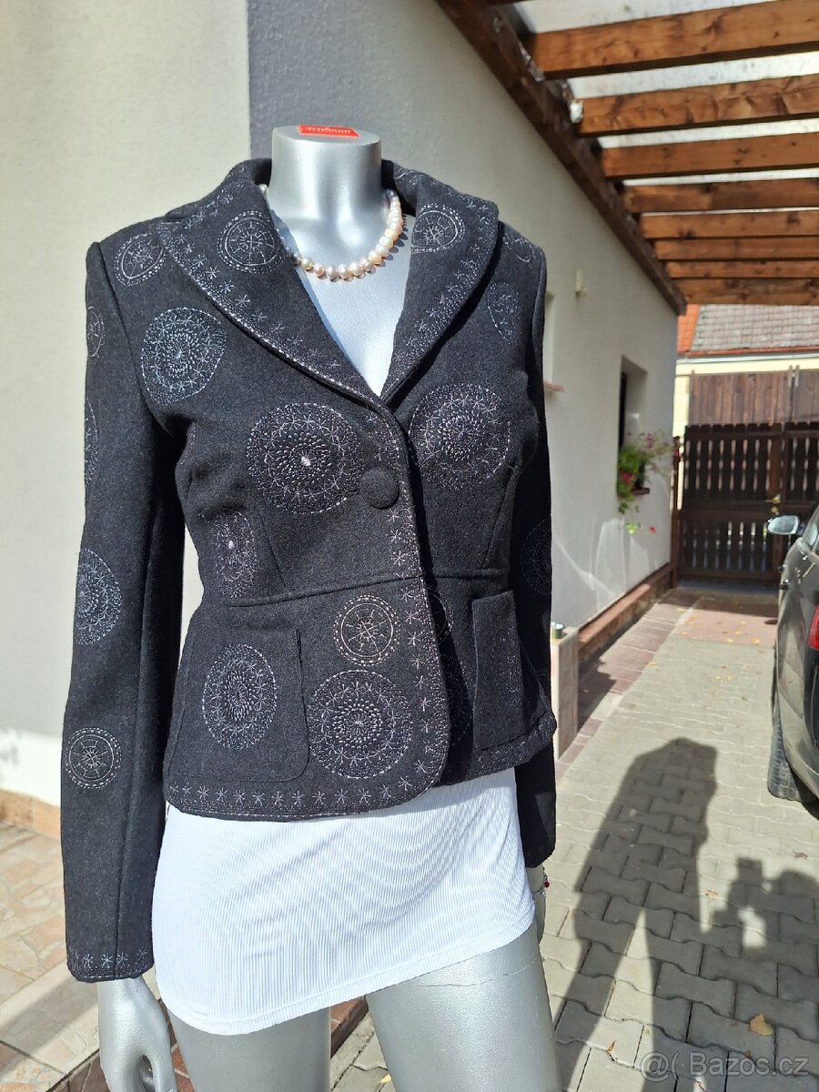 Nádherné sáčko je velice pěkně propracované - velikost 38 - délka od ramen dolů 57cm, délka rukávů od ramen 63cm, od podpaží 44cm, obvod v podpaží 96cm. Tvar mírně do A, přední strana přestřižena v délce od ramen 40cm. Zapínání na jeden látkový knoflík, 2 přední funkční kapsy. Zajímavě propracované klopy. Materiál 60% bavlna, 40% viskoza. Vnitřek vč. rukávů - polyesterové, černé, proužkované futrování. V ramenou nízké vycpávky. Vzadu rozparek v délce 16cm. Barva černá, bílé vyšívání. Foceno na sluníčku. Velmi kvalitní německý vyrobek. Sáčko je jako nové,2x na sobě, bez poškození či vad. Zasílám Balíkovnou, Zásilkovnou i na dobírku.