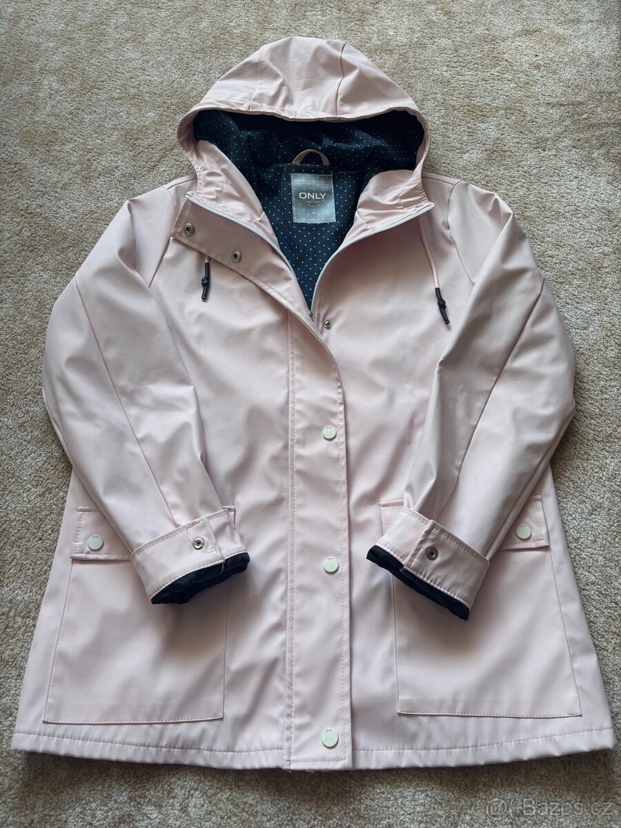 Prodám dámský kabát do deště jemně růžové barvy, zapínání na zip + patenty. Délka 70 cm.