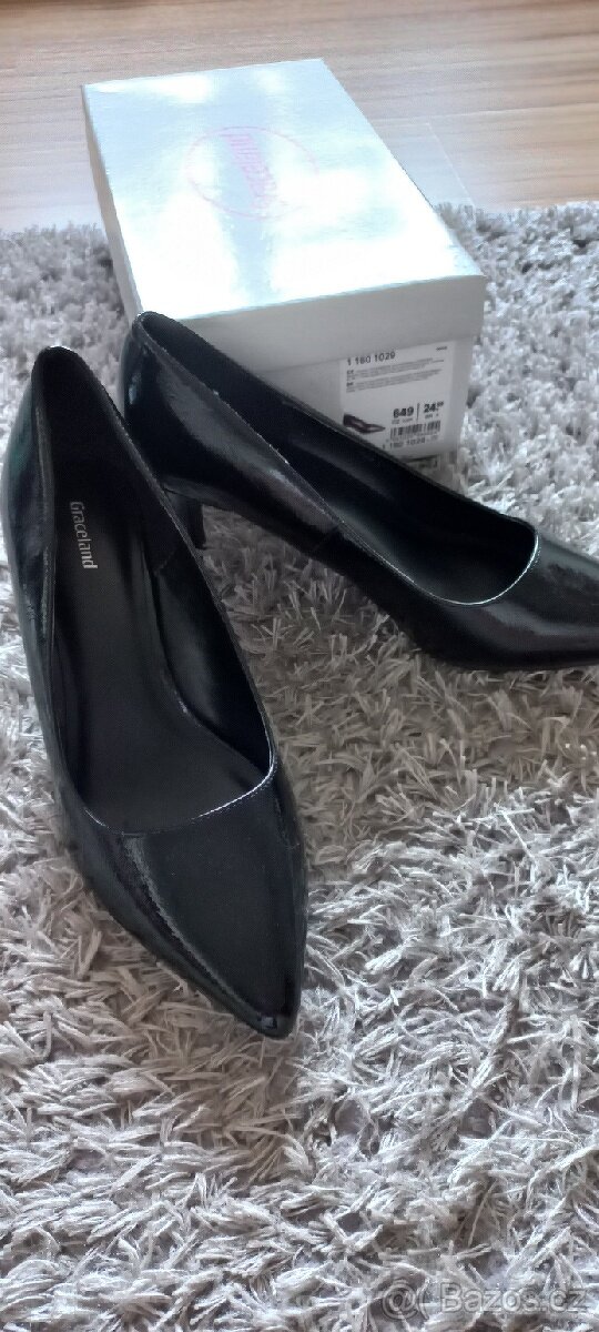 Prodám kožené lakové černé elegantní lodičky originál GUESS - [27.2. 2026]Prodám černé luxusní kožené lakové lodičky originál GUESS. Velikost 37 i trochu menší na úzkou nohu. Lodičky jsou velmi elegantní se zlatým zdobením na úzkém štíhlém podpatku. Výška podpatku je 6,5 cm. Jsou jako nové, pouze 2x nošené. Pouze osobní od ...