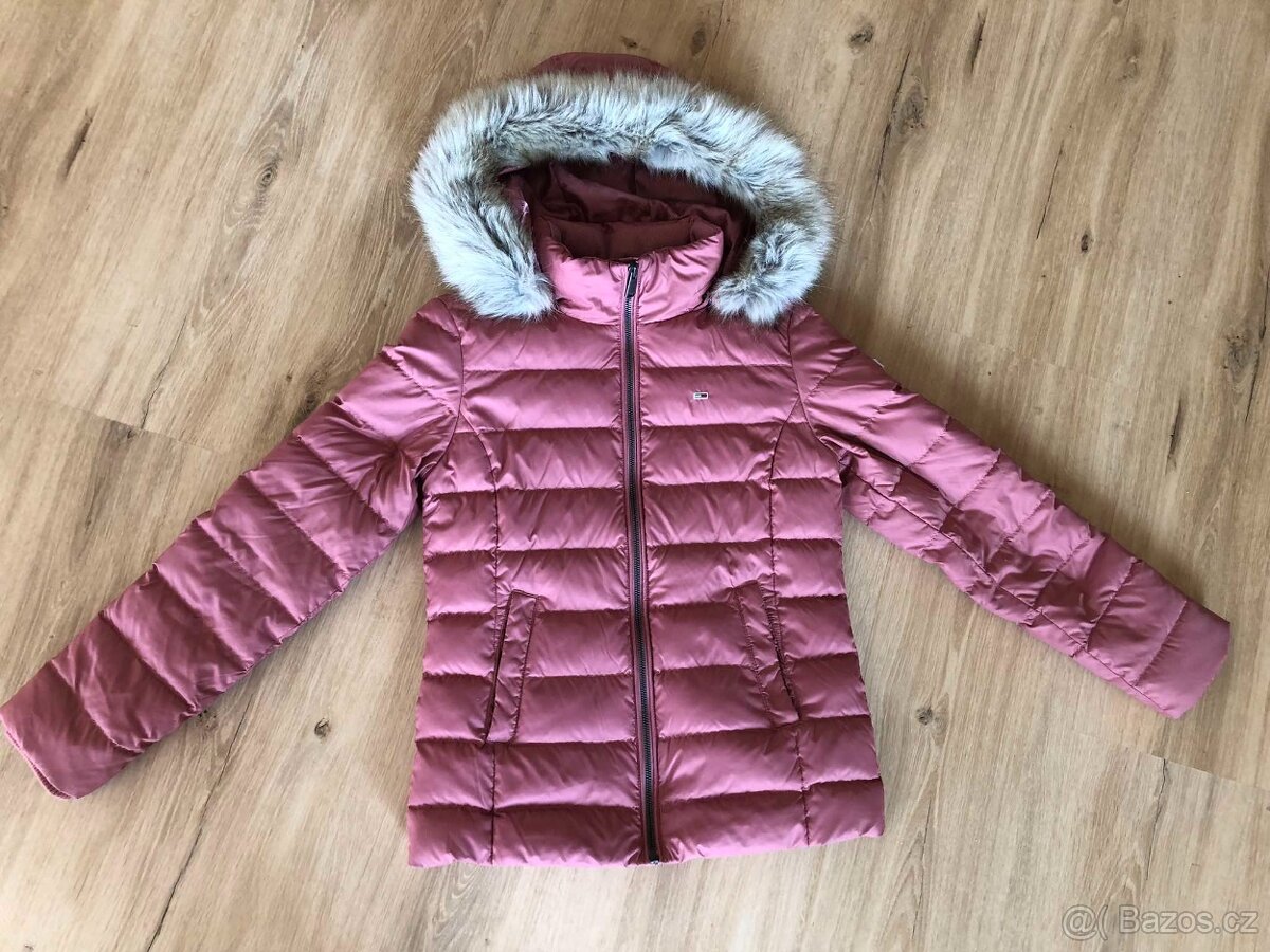Krásná bunda Tommy Hilfiger, péřová, odepínací kapuca, starorůžová barva. Velikost S.