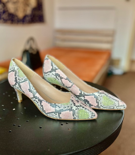 Nové, barva růžová,černá, mint.Stélka 26cm, Výška podpatku 6,5cm (včetně podpatěnky).Zajímavě střižený svršek.