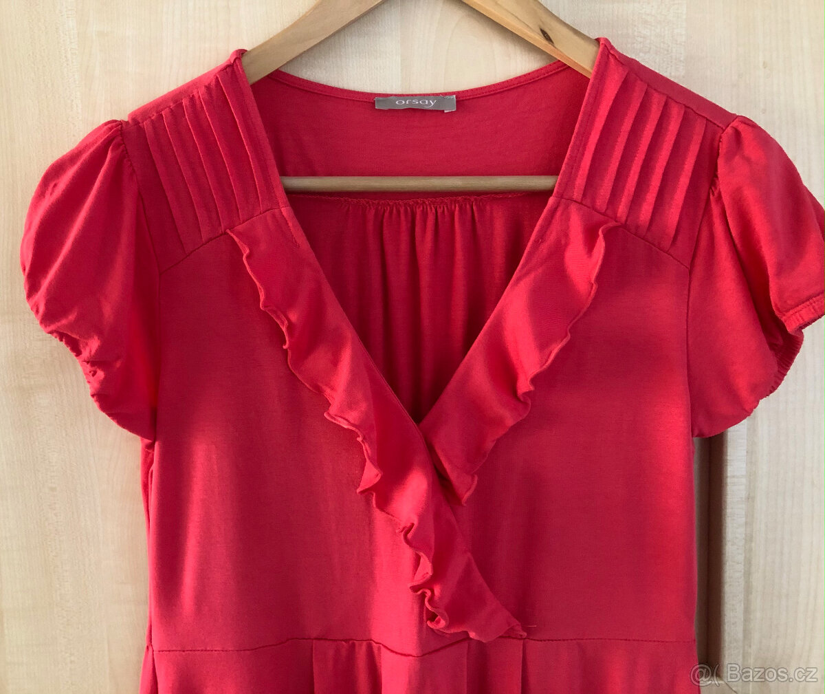 Šaty mají přeložený přední díl, nabírané rukávy do gumičky. Sukně má stih do A, na předním díle tři sklady.Barva je méně intenzivní než na fotce.Délka 89cm,Délka do pasu 35cm,Šířka boky 46cm,Délka rukáv 12cm.Krásně kryjí bříško.