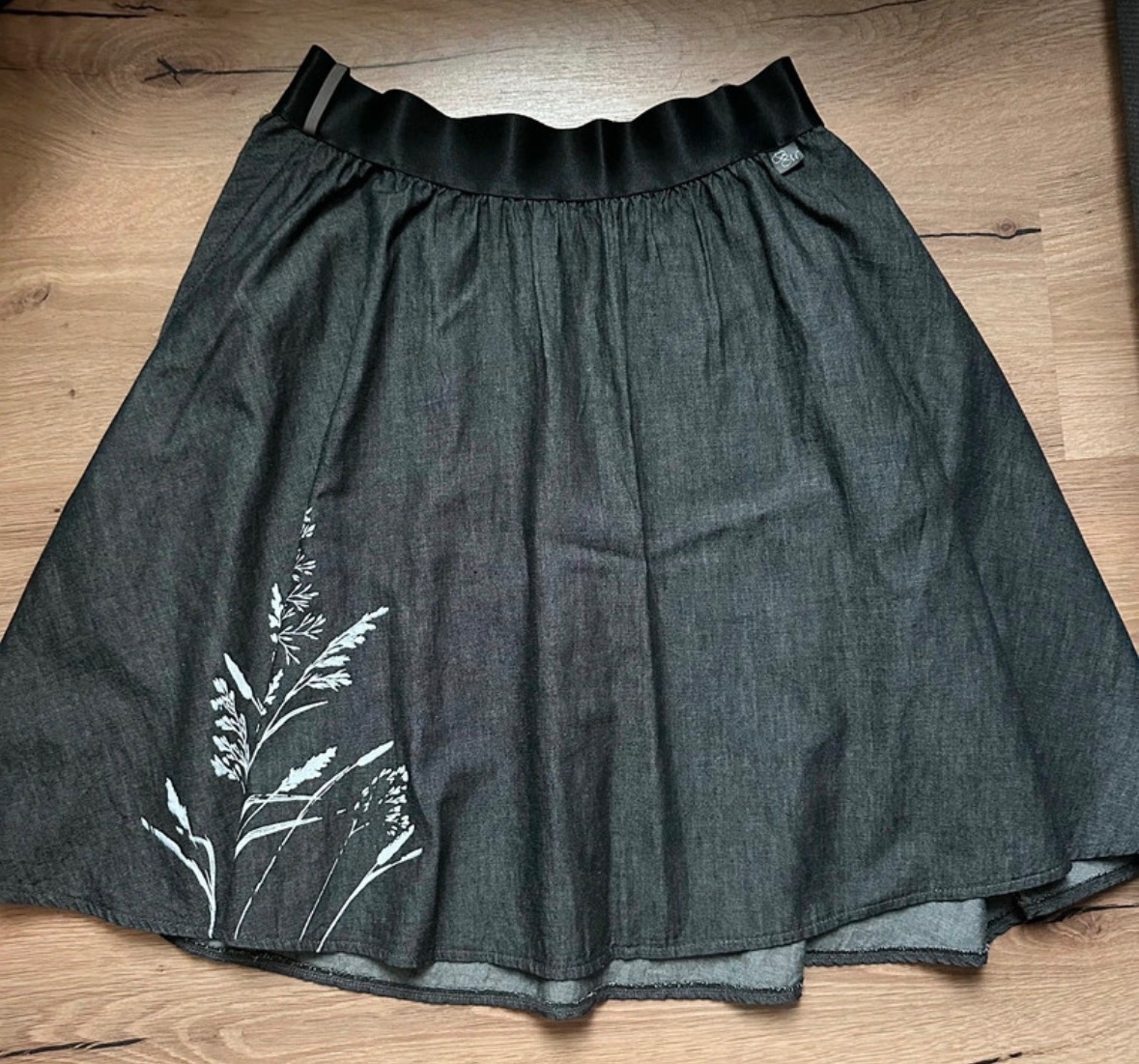 Půlkolová sukně Black Mountain tmavě šedá žíhaná sítotisk traviny - pas 33,5 cm, délka vpředu 51 cm, vzadu 54 cm. Saténová guma v pase, 100% bavlna bez podšívky, 2 kapsy. Vzatá asi 3x, top stav.