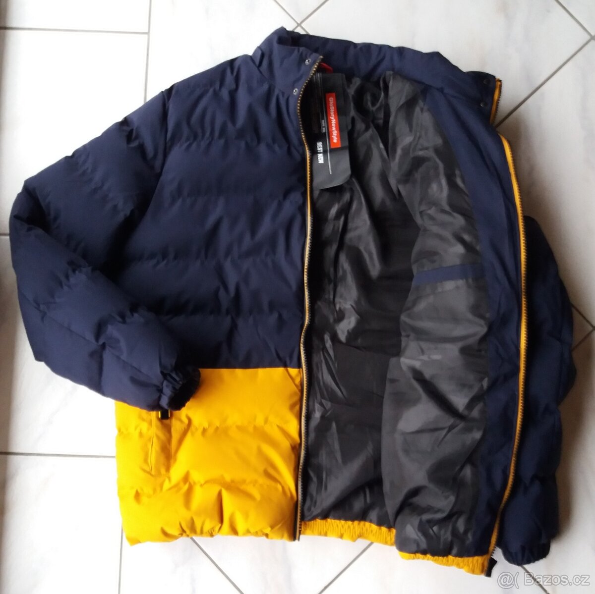 Prodám pánskou zimní lehkou bundu. Velikost XL. Jako nová, pár krát použitá. Barva je tmavě modrá, dole je tmavě žlutá. Bez kapuce. Délka 85cm, šířka ramen cca 51-52cm, délka rukávu od ramene cca 61-62cm, délka rukávu od podpaží cca 41cm, obvod pod podpaží cca 62cm. Cena 750 Kč + 75 Kč poštovné do balíkovny nebo +105 Kč na adresu