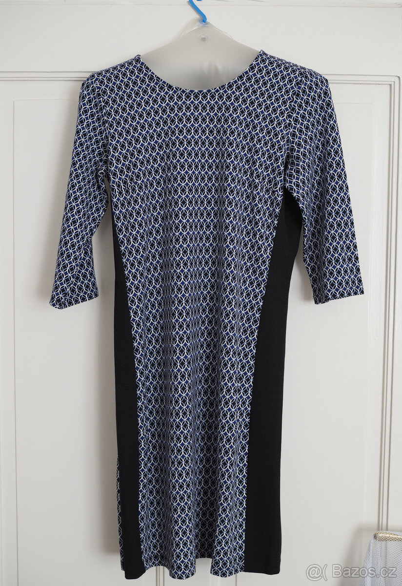 Dámské šaty, S - [28.2. 2026]Šaty jsou nošené, dobrý stav. Mírně pruží. Tmavě modrá - bílá. Přes prsa 42cm, v pase 32cm - pružný materiál, přizpůsobí se.