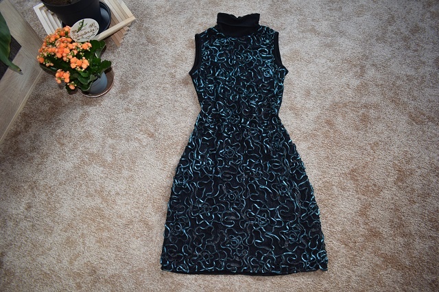 Prodám krásné šaty o velikosti odhaduji xs,s/34/36, zn. Miss Frida. Vzadu na krku jsou na 3knoflíky s kamínkem. Vzadu jsou celé černé, vepředu černá krajka + tyrkysovo perleťové klikiháky (ve skutečnosti hezčí, na fotce to tak nevynikne). Dlouhé 84cm, pod pažemi 2x38cm v klidu - jsou pružné, krásně se přizpůsobí postavě. 92%nylon, 8%elastan.