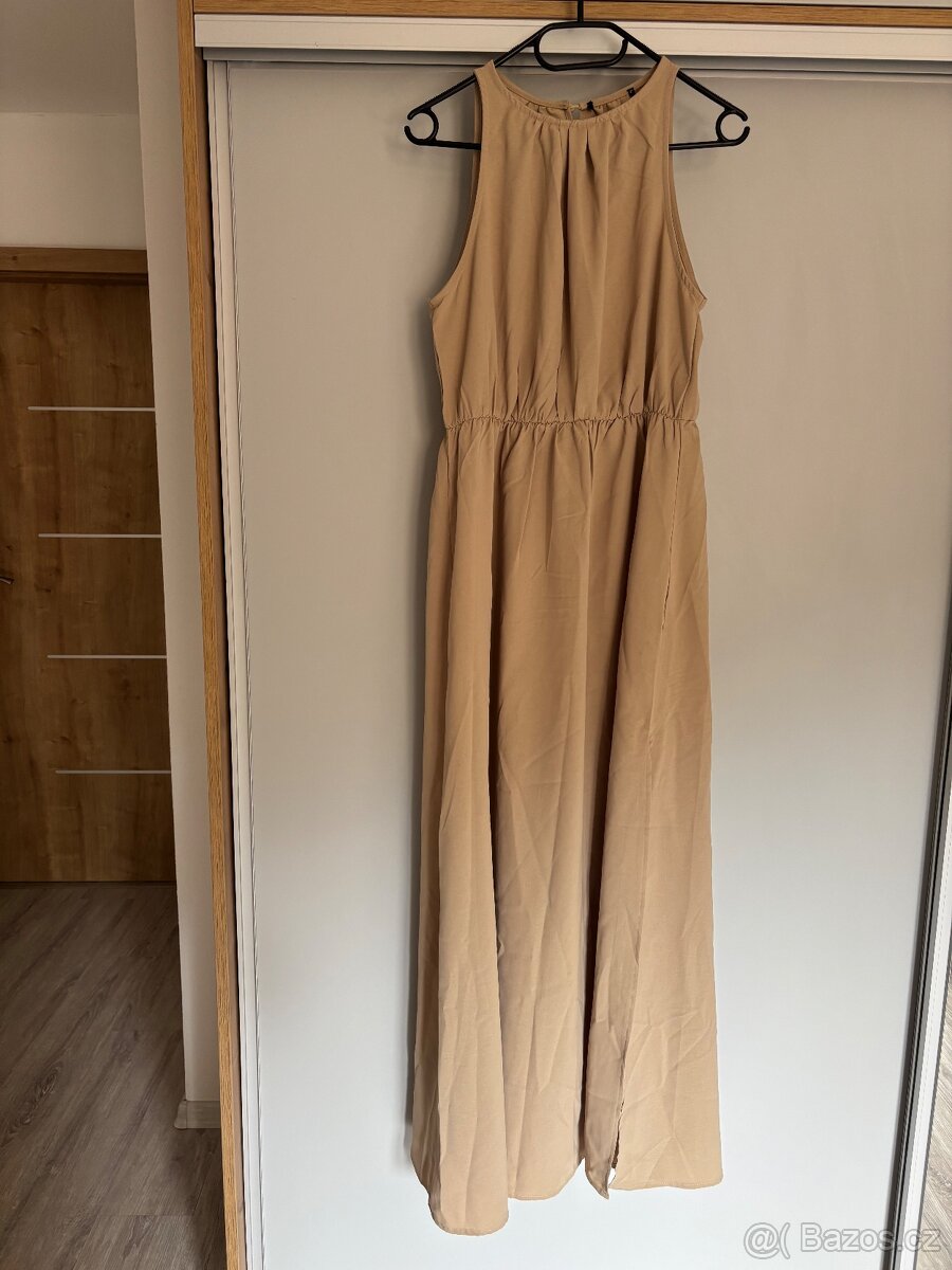 Prodám dámské šaty velikost M, celková délka šatu od ramen dolů je 143cm. Jsou krásně volné. Doma jsem je pouze vyzkoušela. Takže jsou nové. Šaty mají od stehen dolů rozparek. Šaty mají na zádech zapínání na jeden knoflík.